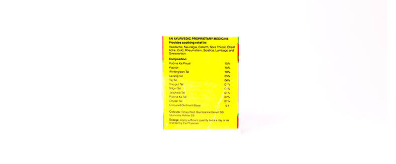 Description:Pudina Ka Phool 15% + Kapoor 10% + Wintergreen Tel 18% + Lavang Tel 5% + Taj Tel 6% + Cajuput Tel 1% + Nilgiri Tel 1% + Jatiphala tel 1% + Pudina ka Tel 7% + Devdar Tel 1%